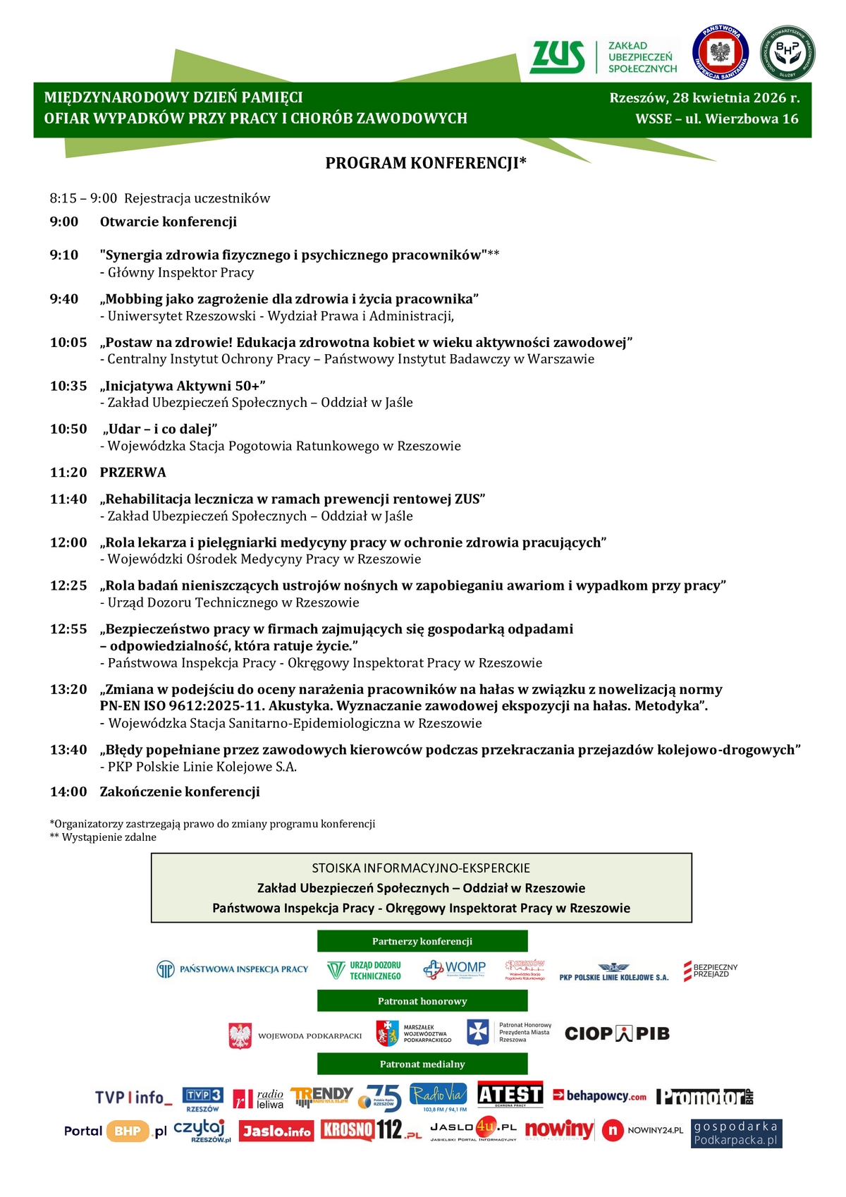 Oddział Zakładu Ubezpieczeń Społecznych w Jaśle i Rzeszowie przy współpracy z Wojewódzką Stacją Sanitarno – Epidemiologiczną w Rzeszowie oraz rzeszowskim oddziałem Ogólnopolskiego Stowarzyszenia Pracowników Służby BHP zapraszają do udziału w ósmej edycji ogólnopolskiej konferencji w ramach obchodów Dnia Bezpieczeństwa i Ochrony Zdrowia w Pracy - Międzynarodowego Dnia Pamięci Ofiar Wypadków Przy Pracy i Chorób Zawodowych. Odbędzie się ona 28 kwietnia 2026 roku (wtorek) od godz. 9:00 w Rzeszowie – przy ul. Wierzbowej 16 (siedziba WSSE).