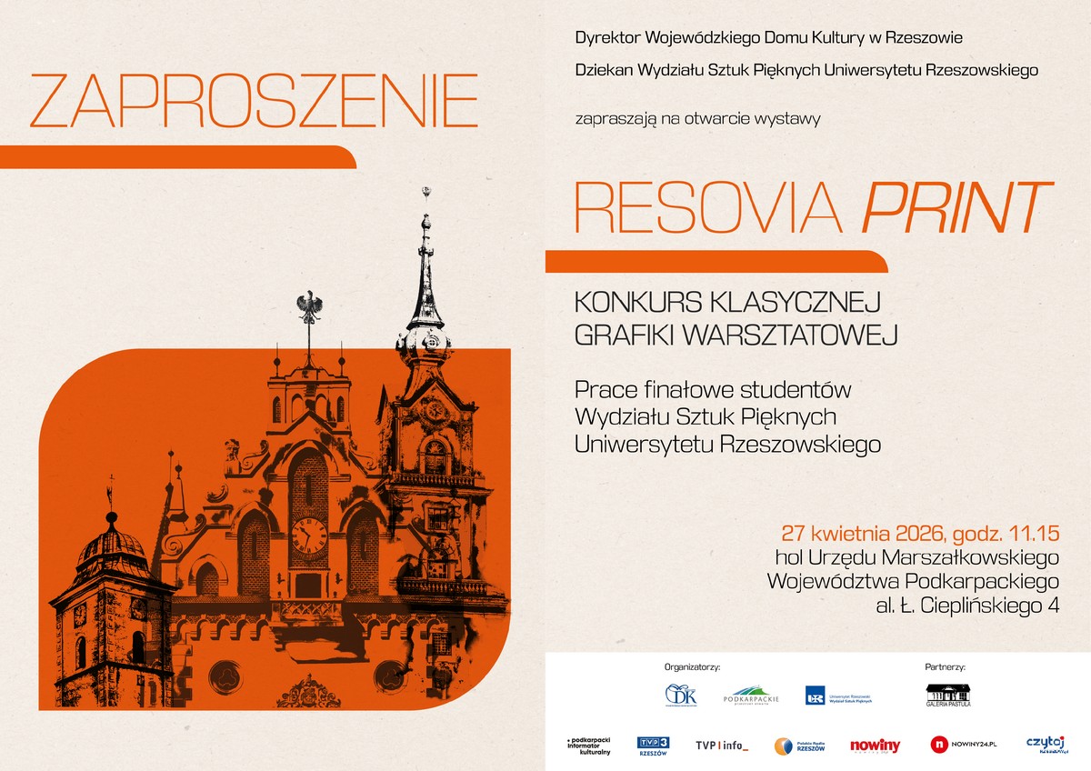 W poniedziałek 27 kwietnia o godz. 11.15 w holu Urzędu Marszałkowskiego Województwa Podkarpackiego otwarta zostanie wystawa prac studentów Wydziału Sztuk Pięknych Uniwersytetu Rzeszowskiego, które znalazły się w finale Resovia Print 2025 – Konkursu Klasycznej Grafiki Warsztatowej zorganizowanym pod koniec 2025 roku przez Wojewódzki Dom Kultury w Rzeszowie we współpracy z Wydziałem Sztuk Pięknych Uniwersytetu Rzeszowskiego.