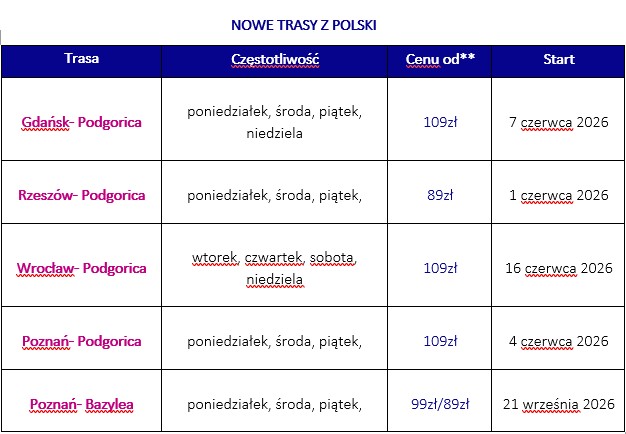 - Nowe trasy dodatkowo wzmacniają obecność Wizz Air w Polsce, gdzie linia konsekwentnie rozwija siatkę połączeń. Obsługiwane nowoczesnymi samolotami Airbus A321neo loty do Czarnogóry i Szwajcarii oferują podróżnym wygodny sposób na odkrywanie jednych z najbardziej unikalnych i malowniczych miejsc w Europie - zaznacza węgierski przewoźnik.