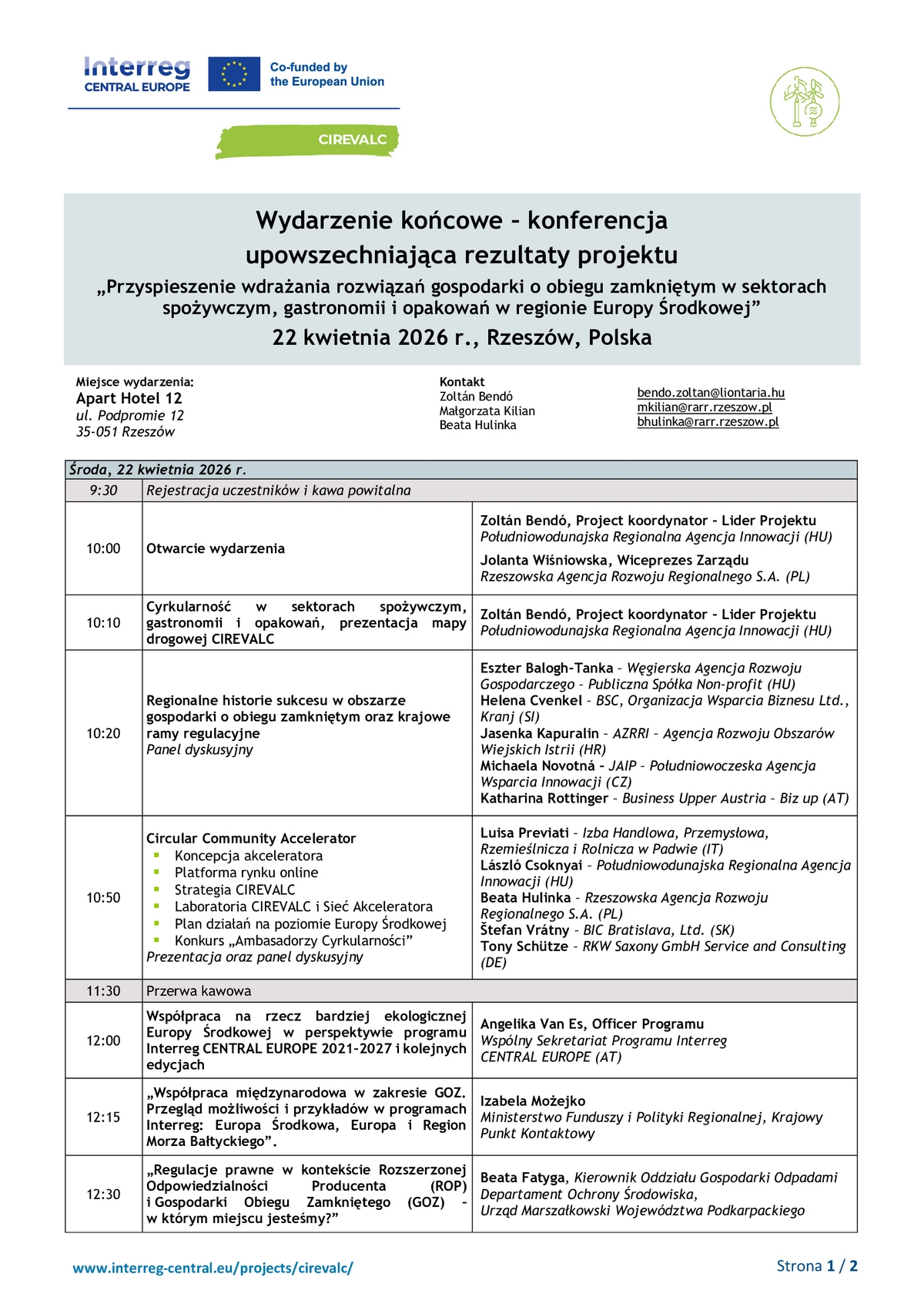 Rzeszowska Agencja Rozwoju Regionalnego S.A. oraz zespół projektu „CIREVALC” zapraszają do udziału w konferencji pt. „Przyspieszenie wdrażania rozwiązań gospodarki o obiegu zamkniętym w sektorach spożywczym, gastronomii i opakowań w regionie Europy Środkowej”, która odbędzie się w dniu 22 kwietnia 2026 r. w Rzeszowie (Apart Hotel 12, ul. Podpromie 12).