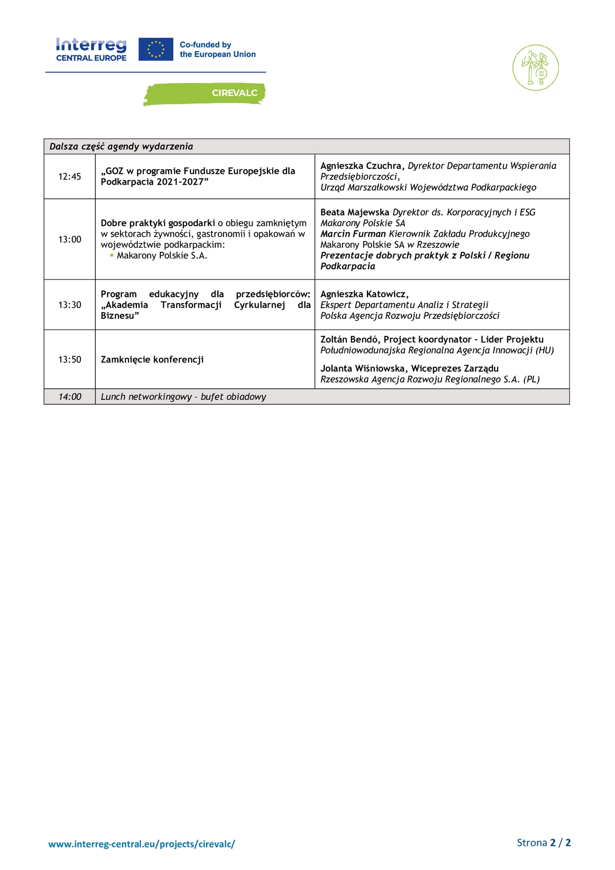 Podczas wydarzenia zostaną przybliżone dobre praktyki i rozwiązania wdrażane w zakresie gospodarki o obiegu zamkniętym (GOZ) w szczególności w sektorach spożywczym, gastronomii i opakowań w województwie podkarpackim w Polsce, oraz w regionach partnerskich z Austrii, Chorwacji, Czech, Niemiec, Słowacji, Słowenii, Węgier i Włoch. W trakcie konferencji podsumowane zostaną również główne rezultaty międzynarodowego projektu „CIREVALC” realizowanego w ramach programu Interreg CENTRAL EUROPE.
