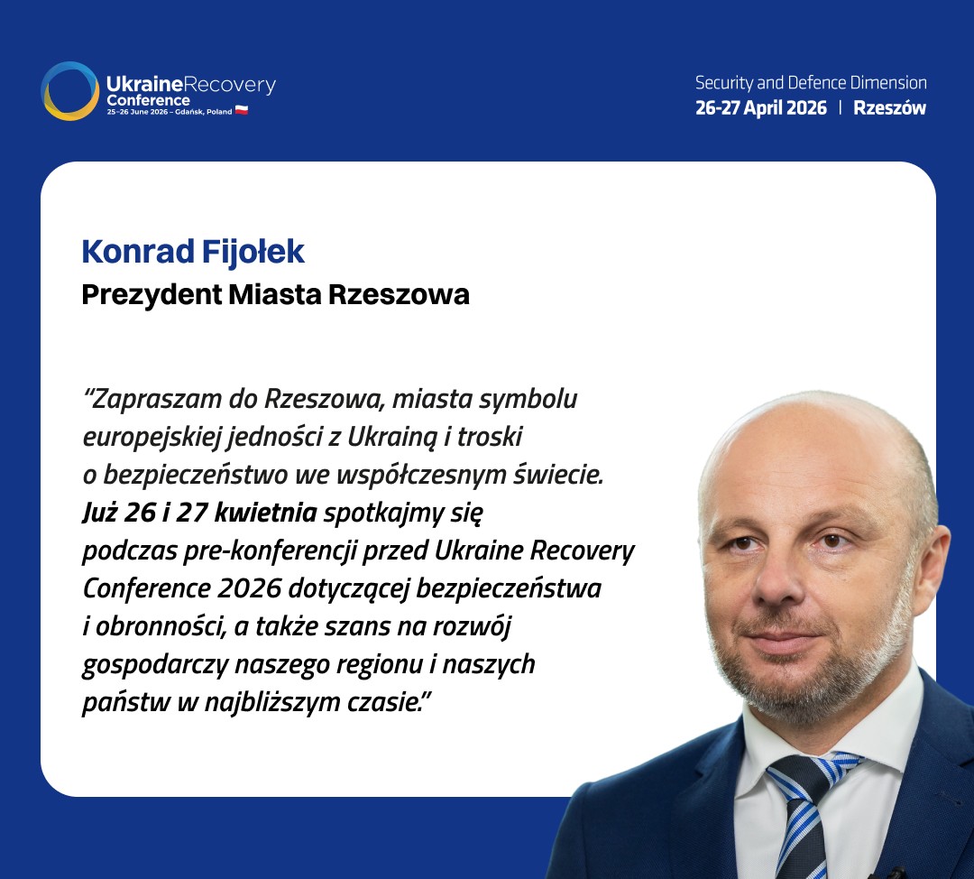 27 kwietnia 2026 r. na Politechnice Rzeszowskiej odbędzie się Konferencja Road to URC „Security and Defense Dimension” w obszarze bezpieczeństwa i obronności, która będzie poświęcona kwestiom obronności, w szczególności przemysłowi zbrojeniowemu. Rzeszowska konferencja stanowi bezpośredni wstęp do międzynarodowego szczytu Ukraine Recovery Conference URC (2026), największego na świecie forum poświęconego odbudowie Ukrainy, który w tym roku odbędzie się w czerwcu w Gdańsku.